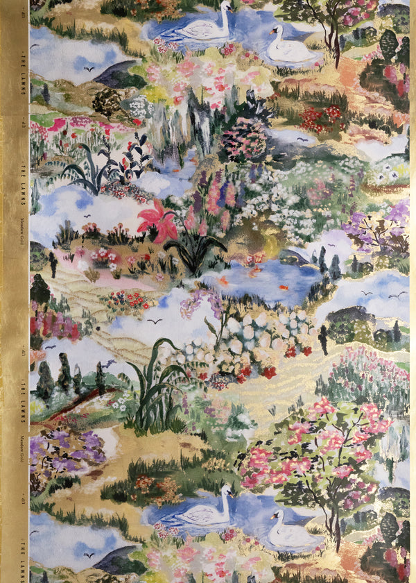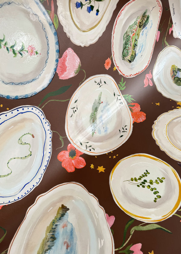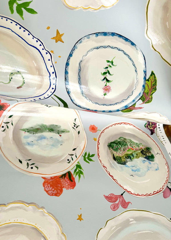 Drawing on elements of Laura's ceramics and hand painted illustrations, the collection features a playful Trompe-l’oeil of a glossy, dimensional tablescape, and a whimsical, hand painted meadow, blending individual vignettes into a sprawling, dreamy landscape.